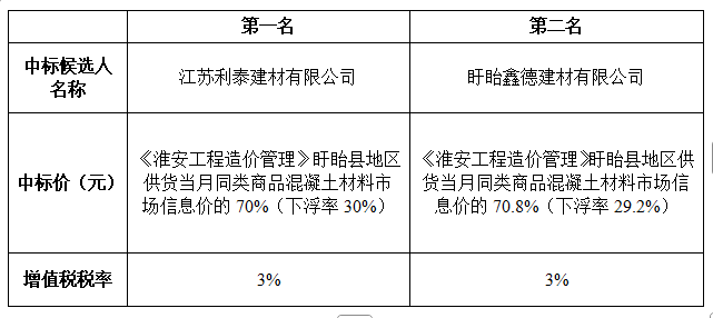 盱眙县2025年度农村生态河道建设工程等三个项目混凝土采购的比价工作已结束,中标候选人已经确定,现将结果公示如下: