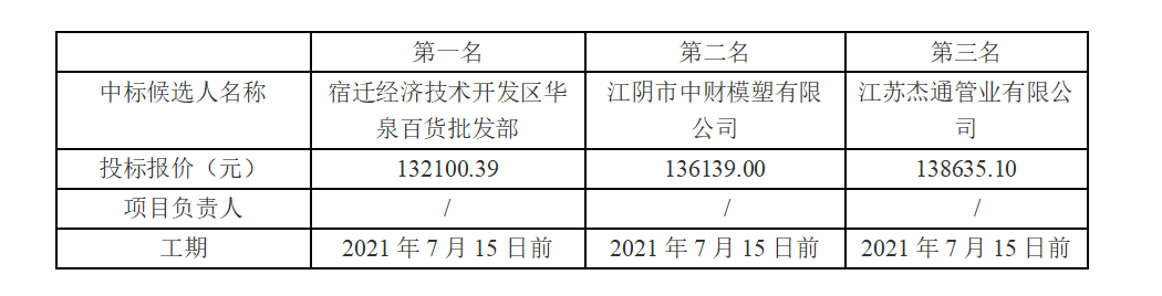 盱眙县2019年度农村饮水安全巩固提升工程PE配件采购项目的评标工作已经结束,中标候选人已经确定。本项目采用经评审最低投标价法的评标办法,现将评标结果公示如下: 中标候选人情况: 拟确定中标人:宿迁经济技术开发区华泉百货批发部 公示期限:2021年6月16日起至2021年6月18日止。 投标人或者其他利害关系人如对上述评标结果有异议的,应当在公示期间向招标人书面提出。 联系电话:0517-80919363 招标人:江苏天源建设集团有限公司 2021年6月16日